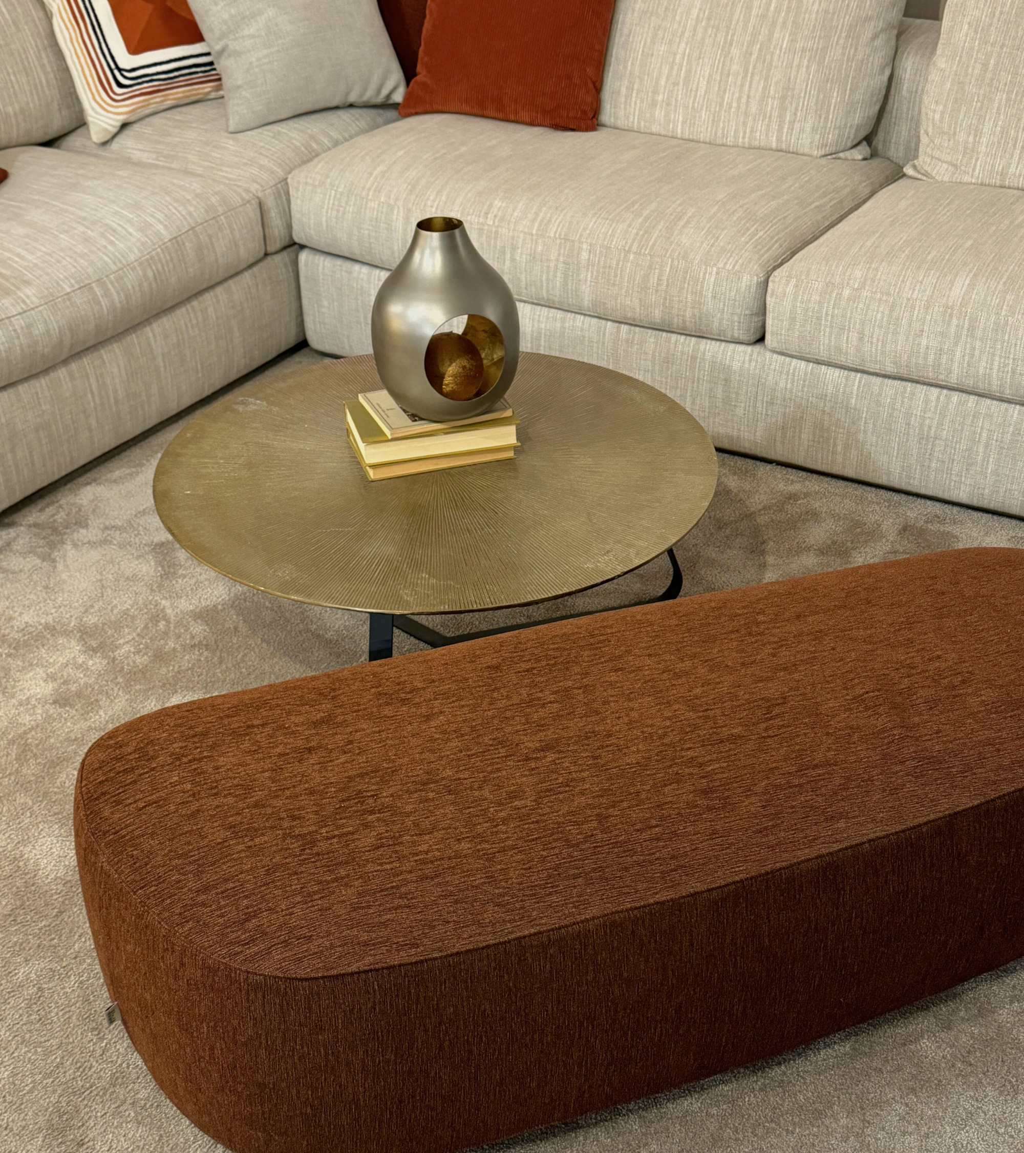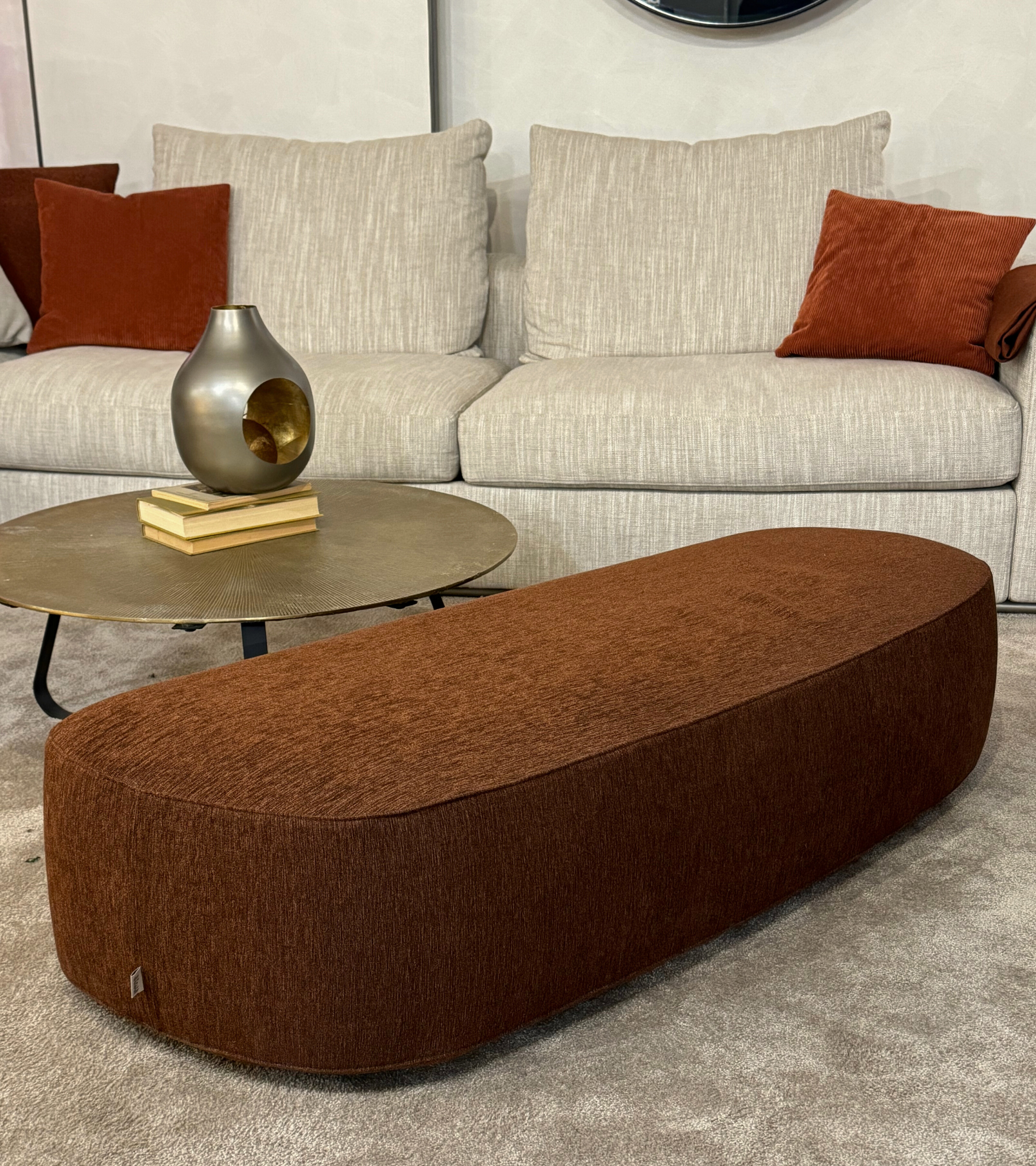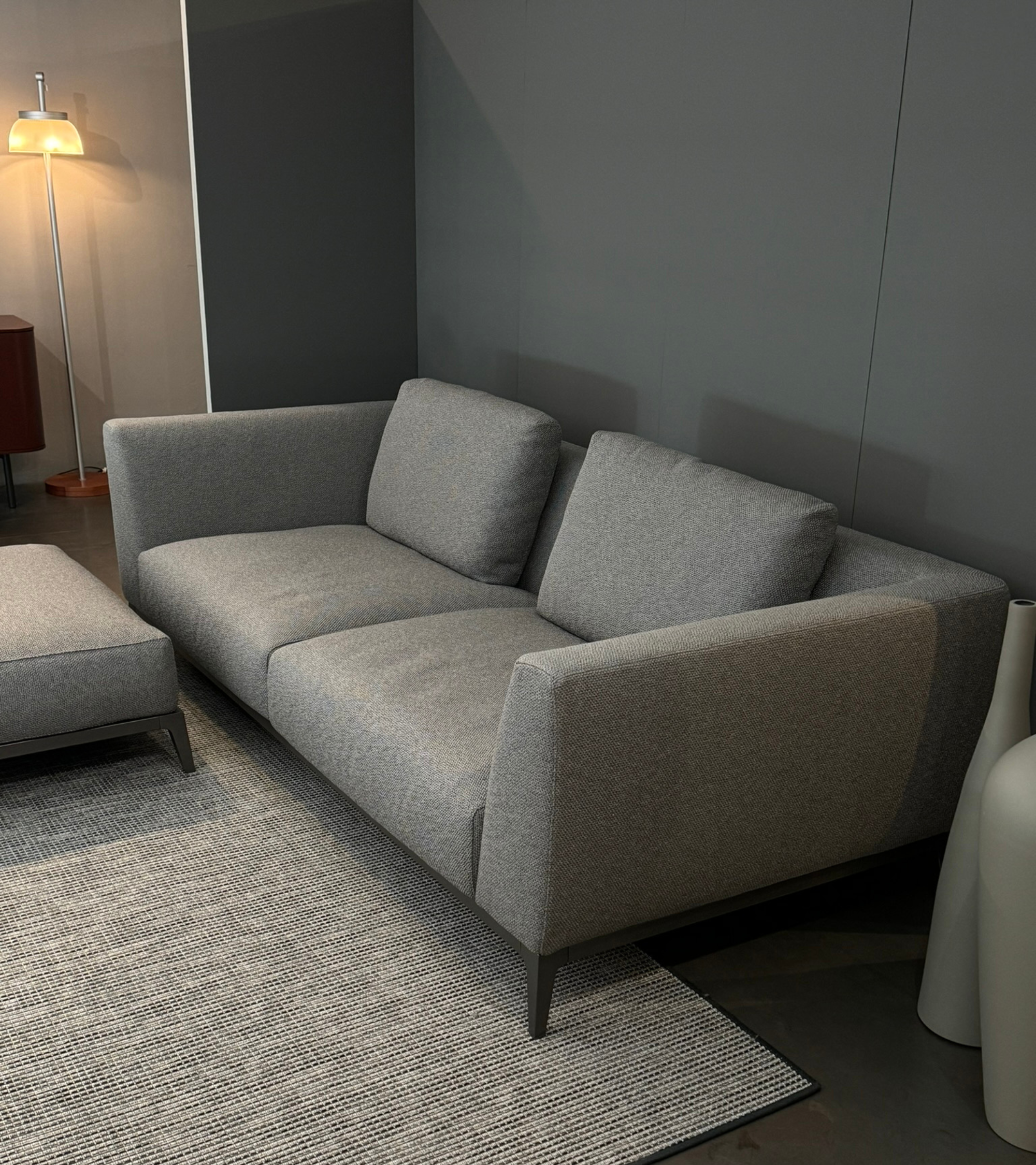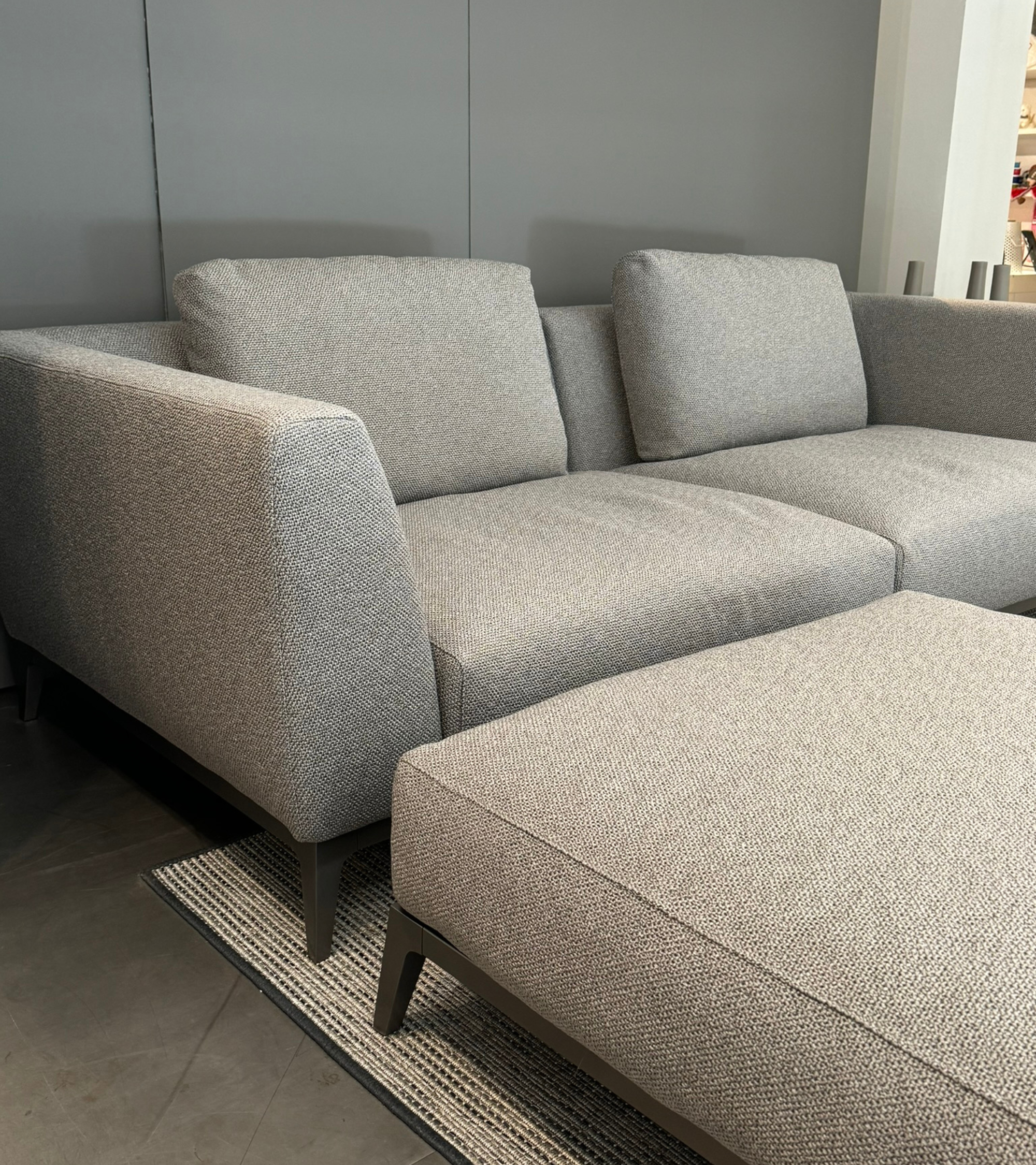 Divano OLIVIER cm. 250x105 prof, rivestito in morbido tessuto LUXOR 576 cat.5 grigio con 2 cuscini schienale cm. 75x50 basamento finitura brunito opaco. Completo di pouf cm. 100x100