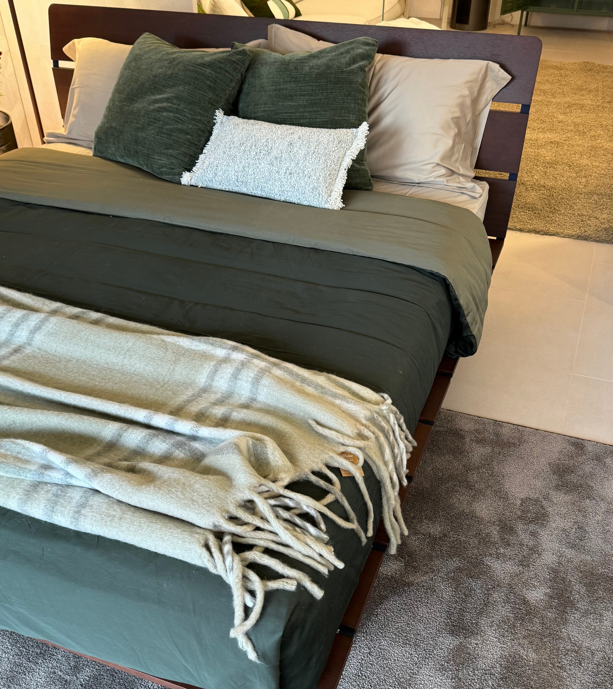 LETTO GAUDÌ cm. 170x200 (ingombro cm. 182x225) con rete a doghe regolabili, rivestimento tessuto RALPH 918 cat.5 , dettagli in legno massello frassino caffè.